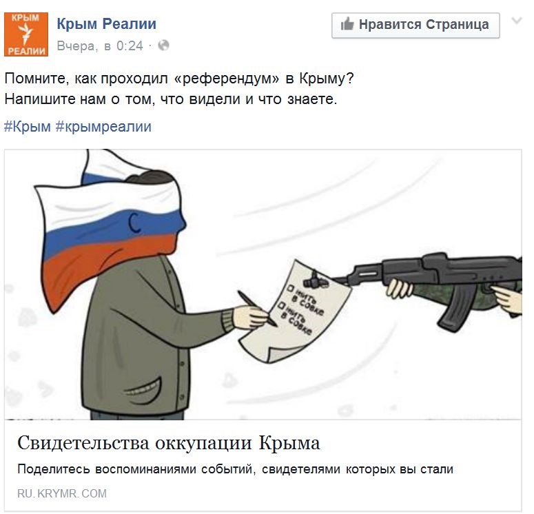 18 февраля, в преддверие годовщины антиконституционного переворота на Украине и начала «Крымской весны», на своей страничке в «Фейсбуке» антироссийский (в основном – антикрымский) портал «Крым.реалии» начал вполне амбициозный проект – «Свидетельства оккупации Крыма». Посетителям, которых в общем-то немало, предлагали поделиться воспоминаниями событий, свидетелями которых они стали. Что же из этого вышло? Как отнеслись крымчане к оккупантам и волеизъявлению под стволами захватчиков? Прочтя комментарии, я понял, что самым знаковым событием 2014 года они считают именно референдум о присоединении Крыма к России. Учитывая общую направленность портала, я думаю, что подавляющее большинство воспоминаний посетителей стали для руководства «Крым.реалии» неприятным сюрпризом: