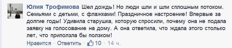 И таких комментариев – сотни… И это без малого через год после события, несмотря на все очереди за паспортами, резкое подорожание продуктов, санкции, невозможность проведать родственников в Украине, войну, в конце концов! Это показатель, что решение, принятое в Москве, Симферополе и Севастополе 27-28 февраля было верным и своевременным.