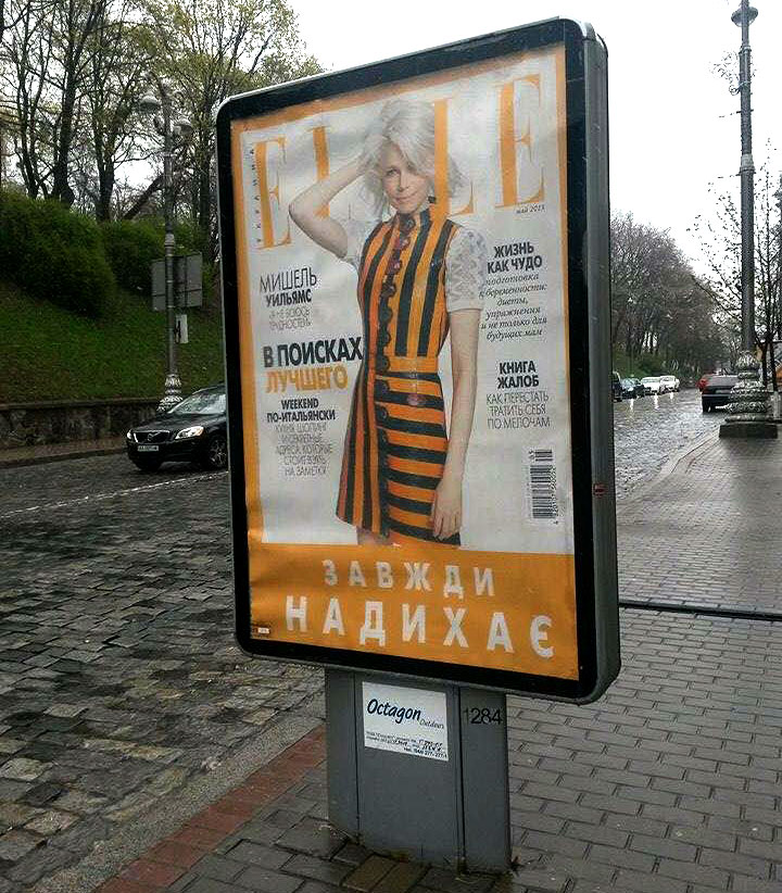 бешенство жовтоблакитного режима. Платье из коллекции Луи Вюиттона представляла 34-летняя американская актриса Мишель Уильямс. Расцветка напоминала георгиевскую ленту, запрещенную бандеровцами как символ победы над нацистской Германией. Аналогичная обложка украшает и британское издание ELLE. Самостийники сразу же назвали новое платье Луи Вюиттона провокацией. Бывший укродепутат Александр Бригинец утверждает, что журнал поместил «одиозную кон-пропаганду георгиевской ленточки». Журнал сменил обложку, указав, что о его гражданской позиции можно прочесть в Facebook. ELLE, очевидно, уважает прославление нацистских преступников на Украине.