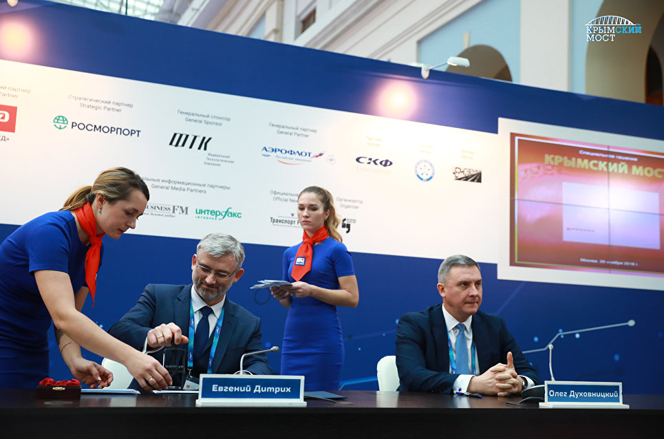 В Москве, в Гостином дворе, прошла торжественная церемония презентации и гашения почтовой марки с изображением Крымского моста. Событие состоялось в рамках «Транспортной Недели 2018», и в нем приняли участие министр транспорта РФ Евгений Дитрих и руководитель Федерального агентства связи Олег Духовницкий.