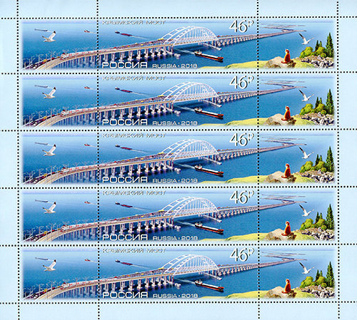 Марка с Крымским мостом поступила в почтовое обращение 6 ноября 2018 года. Ее тираж составил 230 тысяч экземпляров. Новый знак включает два купона, благодаря которым длина марочного листа была увеличена до 183 мм, и художник-дизайнер изобразил самый большой мост России целиком. В ходе работы он изучил чертежи проектной документации, панорамные и другие снимки моста, чтобы сохранить достоверность внешнего облика и конструктивные особенности дороги через Керченский пролив.
