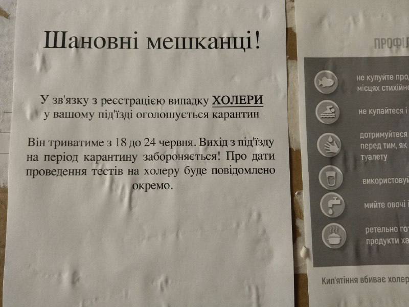 Перевод объявления: «Уважаемые жильцы! В связи с регистрацией случая холеры в вашем подъезде объявляется карантин Он продлится с 18 до 24 июня. Выход из подъезда на период карантина запрещается! О датах проведения тестов на холеру будет сообщено отдельно».